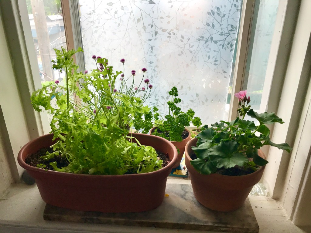 In individual wooden bowls tear green leaf lettuce into bite size pieces, top with crumbled bacon and hard boiled eggs. Dress with vinegar and a dollop of my mama’s homemade mayonnaise.