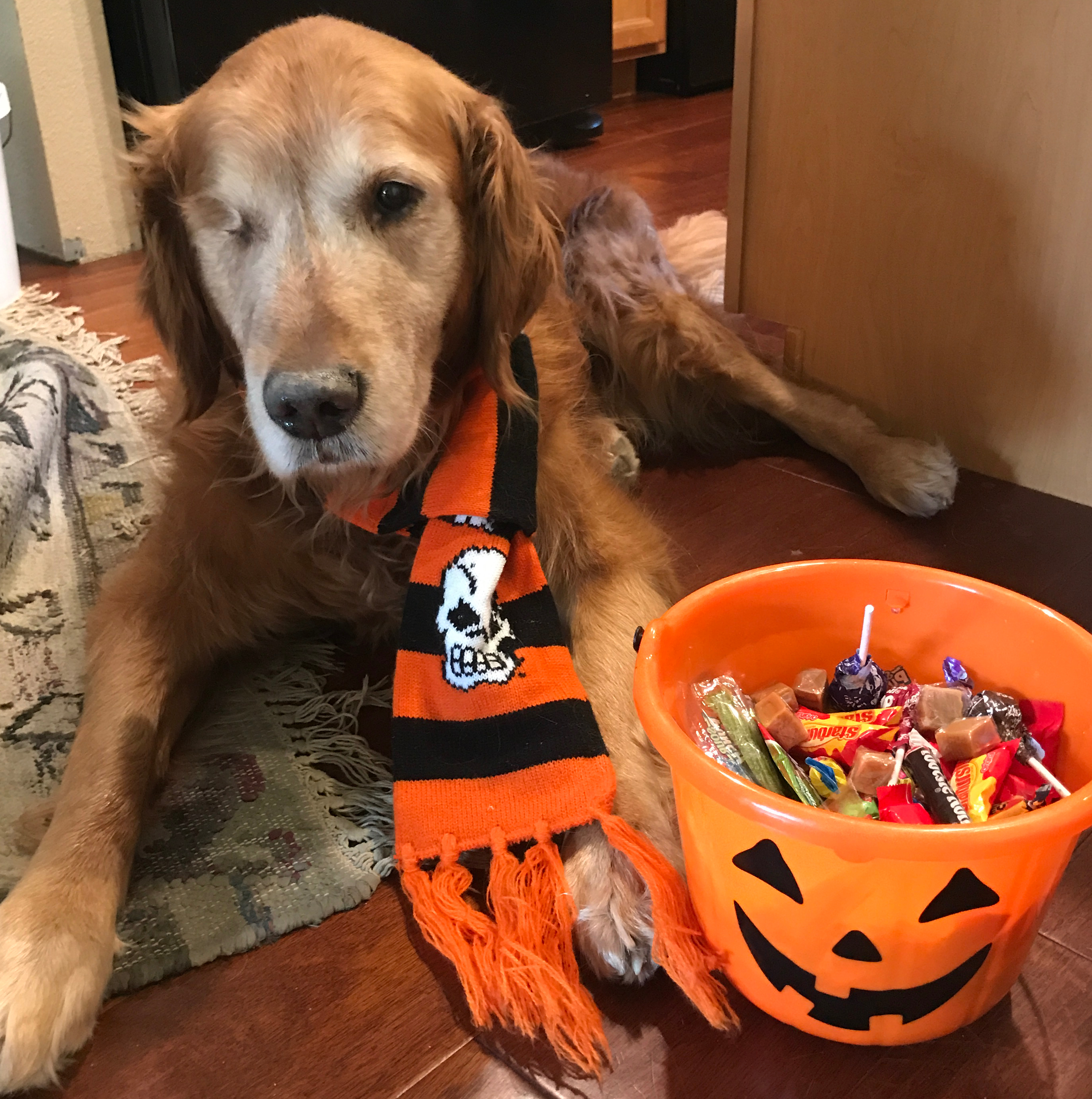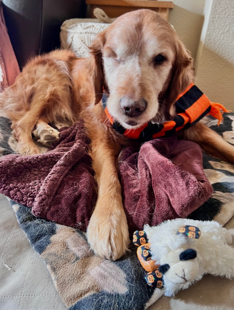 Last year, I was dog sitting for golden retriever, Max. His neighborhood goes all out with decorations. Little ghosts, witches and goblins knock on doors shooting treat or trick. Max, wearing his Halloween scarf, made sure to step out to greet them all and get a pat or two. He and I will be doing it again this year.