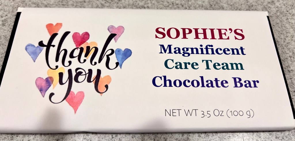 When I became part of her caregiving team, I was impressed by her high-functioning family. Each of her three girls working together to make sure Sophie’s needs were being met. A few weeks ago, her daughters invited the caregiving team for music they performed and dessert. We were sent home with chocolate bars wrapped in a custom-printed label, “Sophie’s Magnificent Team”.