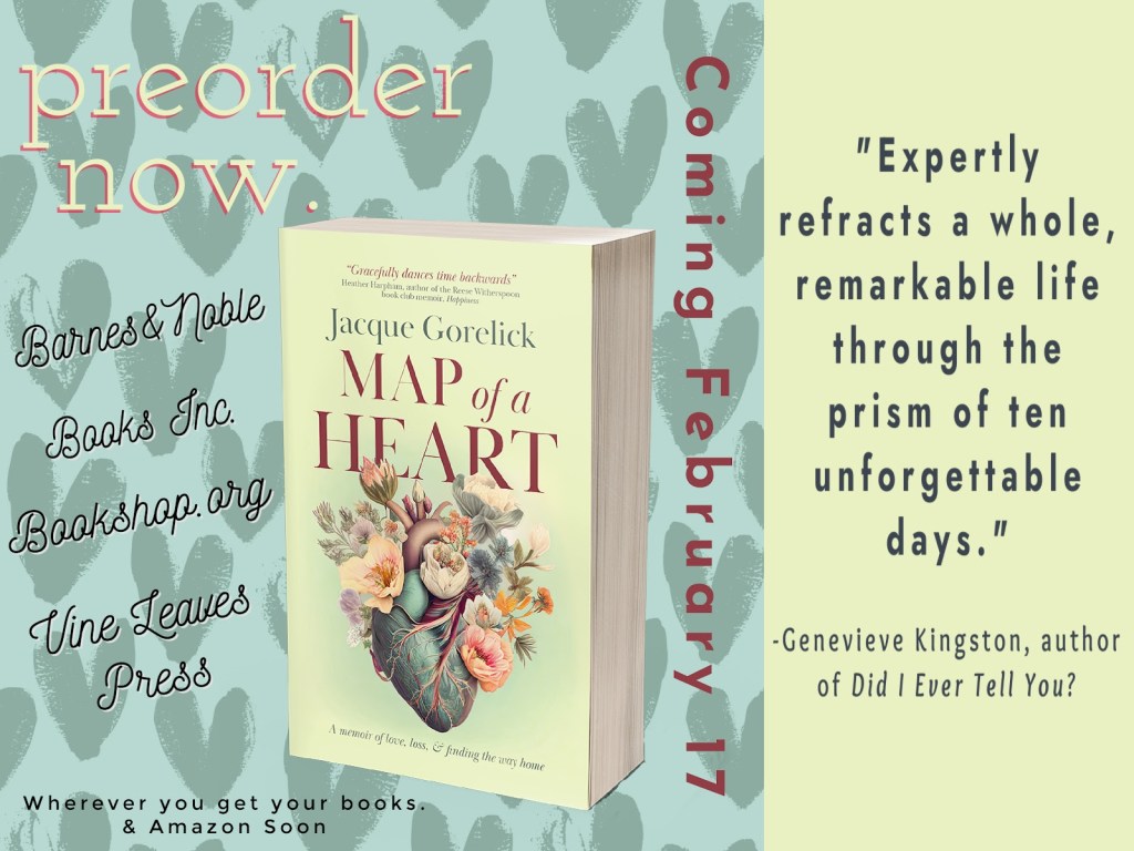 Jacque Gorelick’s book, Map of a Heart: A Memoir of Love, Loss and Finding the Way Home, will be available wherever books are sold on February 17th or you may pre-order it now. Her story puts you right there with her from page one. I was immediately riveted, holding on to hope, awed by the miracle of modern medicine and touched by Jacque’s communtiy who surrounded her during a time of need.