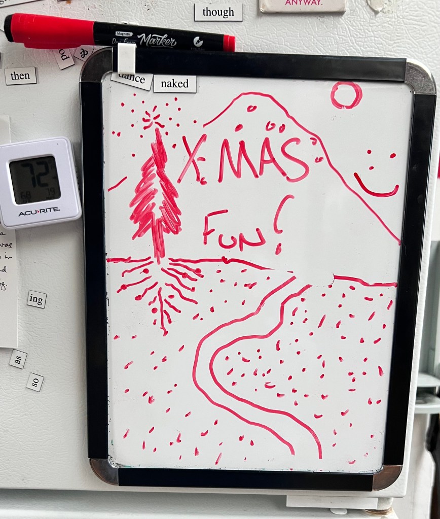 Joseph, a musician and chef, has lived here for a couple of years is cooking a roast for Christmas Eve. Others will contribute to our potluck. I’ll do cheese fondue, leaving the two dogs I’m caring for a couple of hours for our gathering. Robert, the owner, 85 years old, loves it. He really loves when we all gather for food and community.